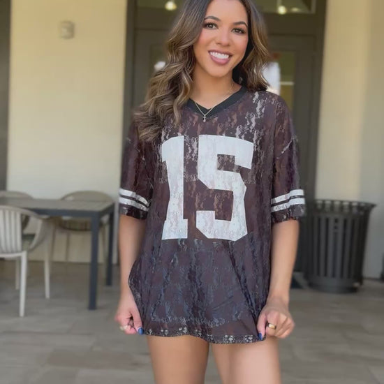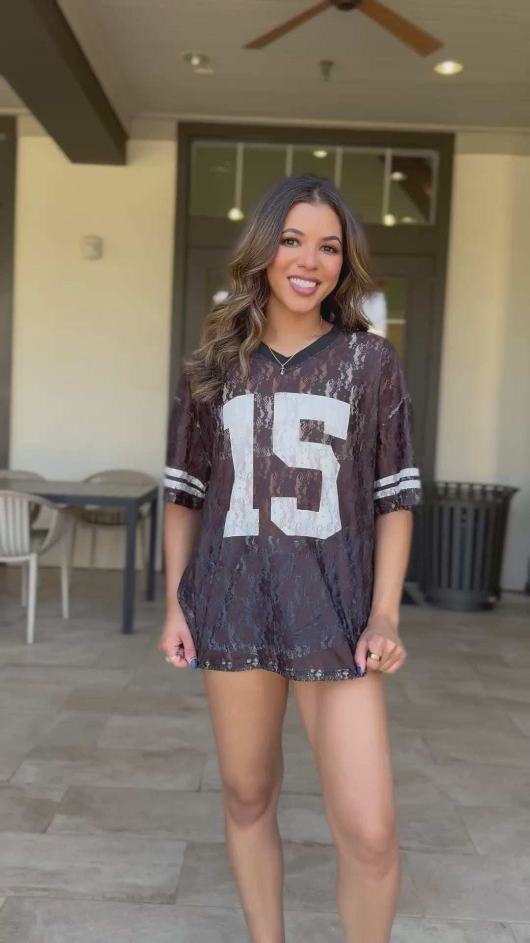 Make a bold statement on game day with this oversized sheer lace football jersey! Designed with classic sleeve stripes and #15 on the front, this black-and-white piece layers perfectly over a bralette, bra, or tank for a sporty-chic look that’s full of team spirit.