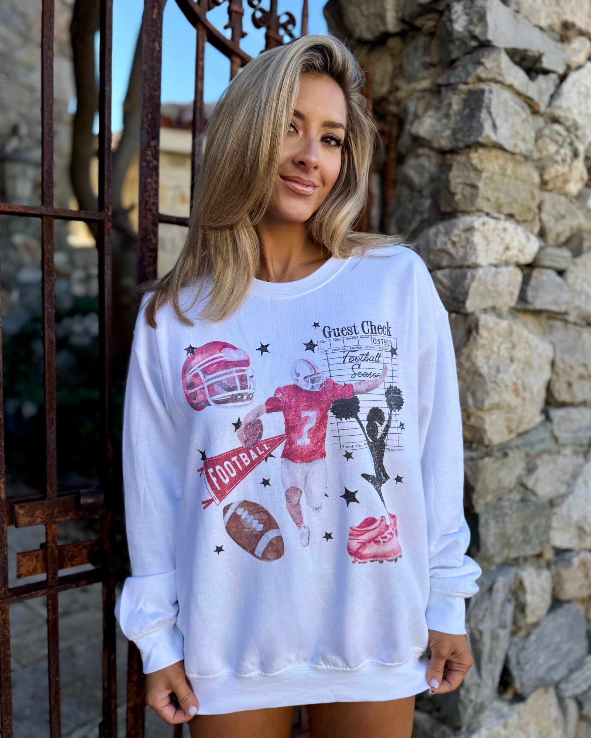 Your new favorite gameday uniform is here. This muted red + white oversized sweatshirt features a playful football-themed checklist graphic that’s both cute and comfy—perfect for stadium seats, tailgates, or Sunday on the couch. Available in S/M and M/L, it’s intentionally roomy and already runs oversized for that relaxed, effortless look.